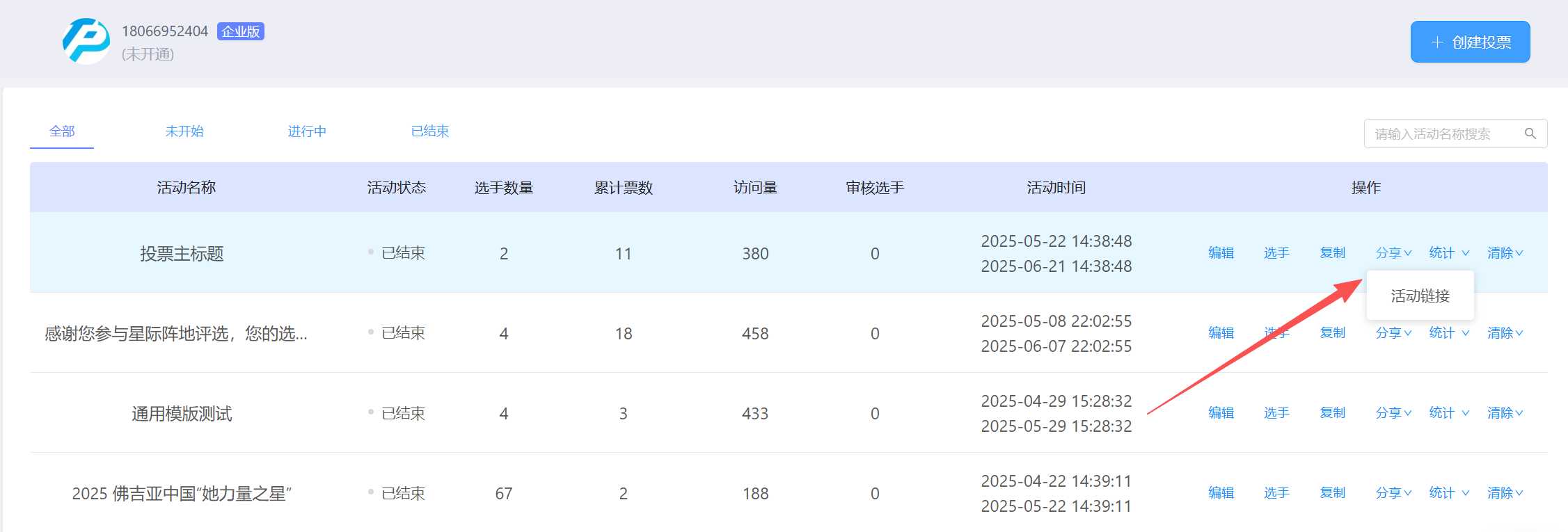 位置一:用户后台首页活动列表后方的操作列表中,点击 “分享” ,选择活动链接,即可获得活动二维码和链接。
